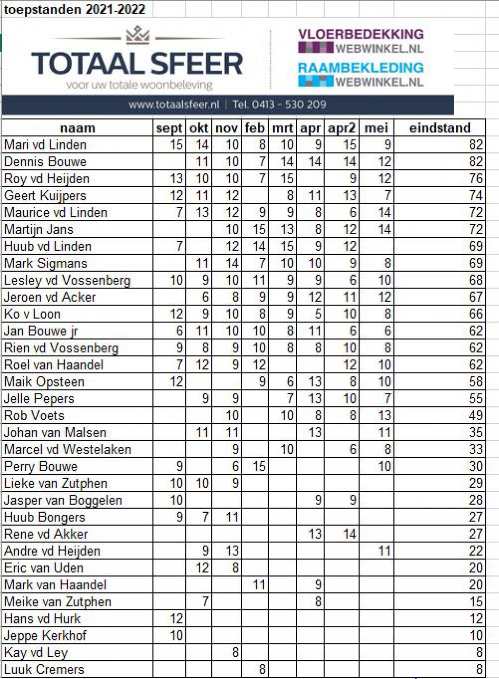 Eindelijk hebben we een topseizoen kunnen uitspelen en het was spannend tot de laatste kaart. Na de laatste speelronde stonden Mari v/d Linden en Dennis Bouwe gelijk in punten zodat er een toep-off moest plaats vinden wie de eindwinnaar van de Totaal Sfeer toepcompetitie 2021-2022 ging worden. Het was uiteindelijk Mari v/d Linden die er met de hoofdprijs vandoor ging. Roy v/d Heijden mocht als derde mee op het podium. Organisator Maurice v/d Linden bedankte de sponsor, kantinepersoneel en deelnemers en reikte de eindprijzen uit. Volgend seizoen, de eerste donderdag van september, gaat de nieuwe toepcompetitie weer van start en iedereen is van harte welkom.