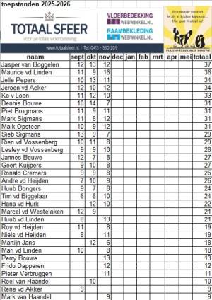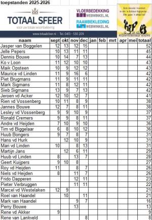 Hierbij de tussenstand van de Totaalsfeer Toepcompetitie presented by Pluimveebedrijf Bouwe 2025-2026 na de ronde van donderdag 4 december. De volgende ronde is op donderdag 15 januari 2026 aanvang 22:00 uur. Iedereen is welkom om mee te .....